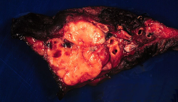 Carcinoid tumor, gross appearance. Most carcinoid tumors are centrally located as is shown here. A unique finding grossly of carcinoid tumors is their distinctive yellowish coloration; whereas most bronchogenic carcinomas have more of a whitish tan coloriation.