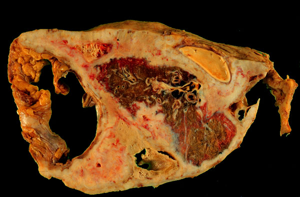 This is the cut section of lung showing a diffuse malignant mesothelioma which is encasing and compressing the lung with extension into the fissures and interlobular septa, as well as focally invading the underlying pulmonary parenchyma. This tumor also diffusely involves the diaphragm which is stuck to the lung.
