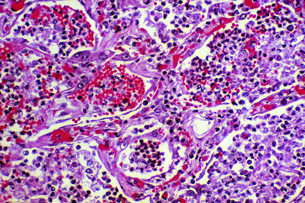 Microscopically, bacterial pneumonias are characterized by many neutrophils filling alveolar spaces, as shown in this slide. Frequently there are admixed red cells and