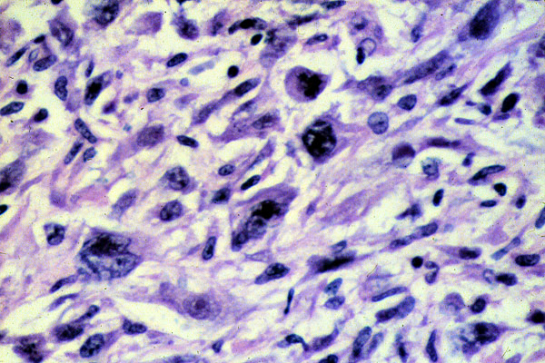 Malignant mesothelioma, higher power, showing malignant mesothelial/epithelial like cells and malignant spindle cells. Malignant mesotheliomas may be difficult to diagnose histologically, requiring multiple special stains and occasionally electron microscopy to correctly classify the tumor.