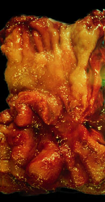This photograph shows the lower segment of the esophagus and cardia of the stomach. The esophageal-gastric junction is occupied by an ulcerating partially exophytic mass that distorts the normal architecture.