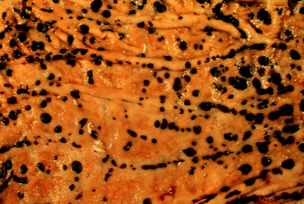 The mucosa of the stomach shows numerous small black dots which correspond to hemorrhagic ulcerations. The color of the ulcerations stems from hematin, a black pigment formed from blood reacting with hydrochloric acid in the gastric juice.