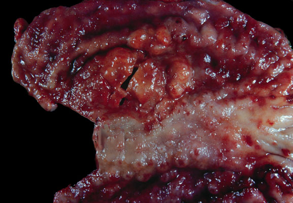 This carcinoma infiltrates diffusely the wall of the stomach. In the midline, the gastric folds seem to be completely effaced by the grayish-white tumor. Above it, the folds appear thickened and irregularly shaped due to the ingrowth of tumor which has distorted the normal architecture.