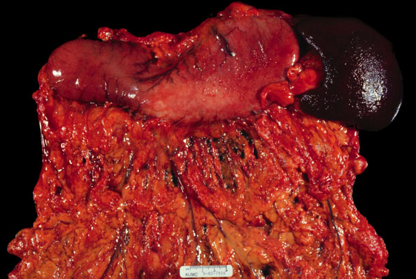 This photograph shows the external surface of the stomach, the spleen and the omentum. The mid portion of the stomach shows a grayish