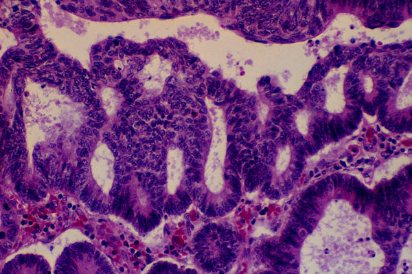 is composed of atypical irregular glands arranged back to back and composed of hyperchromatic cells.
