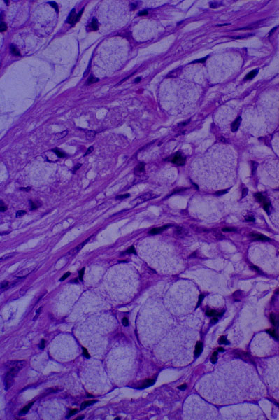 This carcinoma is composed of signet ring cells. The signet ring cells have abundant cytoplasm filled with mucus and peripherally displaced the nuclei which are seen underneath the cell membrane.