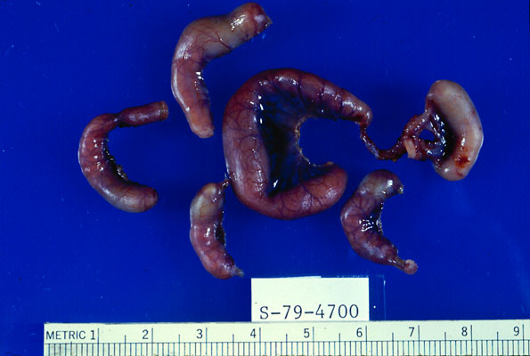 This small intestine resected from a newborn baby shows numerous narrow string-like segments corresponding to the obliterated parts of the intestine.