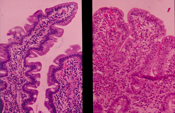 The left portion of the photograph shows normal small intestinal villi. The right part of the picture shows loss of villi and elongation of the crypts typical of celiac disease.