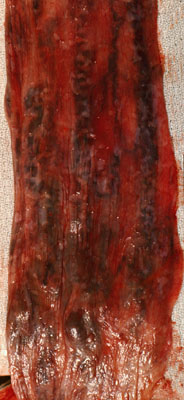 The submucosa of the esophagus contains numerous tortuous veins filled with stagnant bluish blood.