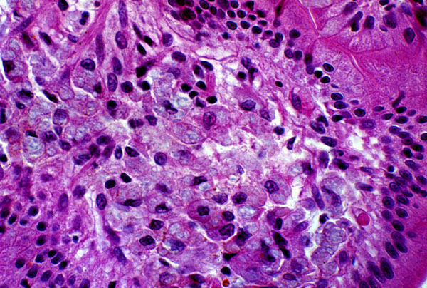 The central portion of the villi is infiltrated with histiocytes that have a granular cytoplasm. The cytoplasm of these histiocytes contains numerous bacteria, which are not seen by light microscopy.