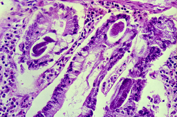 The crypts of the small intestine contain convoluted worms.