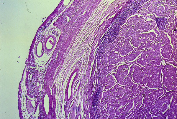The lumen of the appendix is obliterated by solid masses of uniform cells.