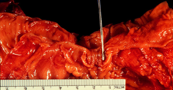 The intestine forms small outpouchings extending into the pericolonic fat. A probe has been inserted into one of the