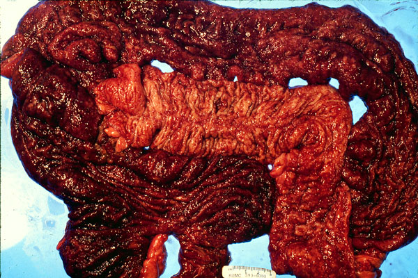 The mucosa of almost the entire large intestine is dark red due to inflammation. Compare it with the centrally located terminal part of the intestine which has the normal brownish yellow appearance.