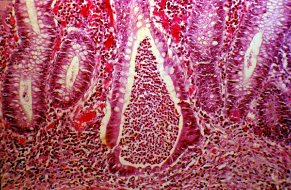 The mucosa is inflamed. In the center of the field, one can see a typical crypt