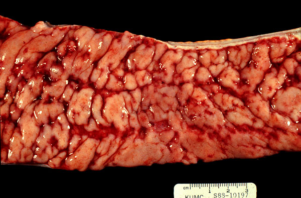Cobblestone appearance of the mucosa results from linear serpiginous ulcerations crisscrossing the surface of the intestine. The whitish islands correspond to the residual inflamed mucosa.