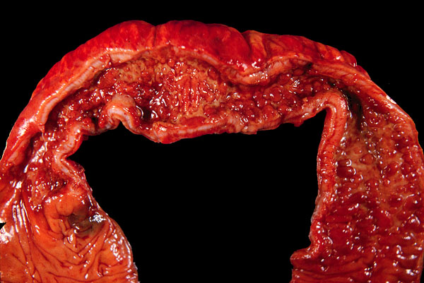 The slide shows the segmental nature of the disease. The part of the intestine that is involved by Crohn disease shows narrowing of the lumen and thickening of the entire wall. The mucosa is ulcerated and has a cobblestone appearance due to numerous linear ulcers surrounding small patches of the preserved mucosa.