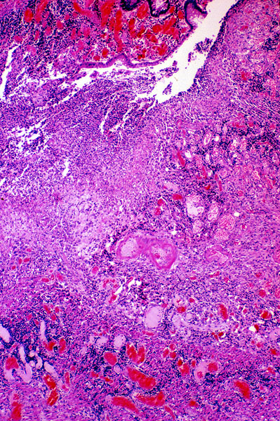 The surface of the large intestine is ulcerated. The underlying wall is diffusely infiltrated with chronic inflammatory cells.