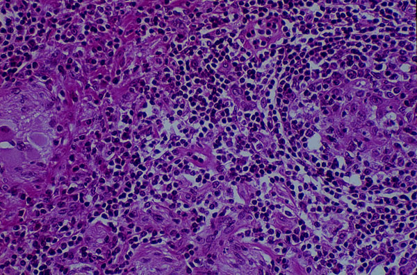 The infiltrate in the wall of the large intestine consists of chronic inflammatory cells and loosely structured histiocytic granulomas.