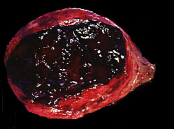 is partially filled with blood. Although this is a benign tumor it may rupture and cause