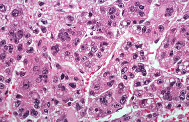 cells are arranged in trabeculae. Note the ground glass appearance of tumor cells indicating protein synthesis (?