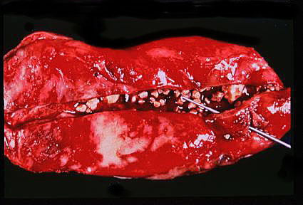 The serosal surface of the gallbladder is red. The gallbladder contains numerous gallstones. The probe was placed into the cystic duct and shows that the duct was patent.