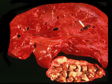The gallbladder contains numerous multifaceted brownish yellow stones. The arrow shows an intrahepatic stone.