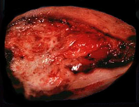 The bisected gallbladder is partially filled with a yellow white mass extending into the wall of the gallbladder, which appears thickened.