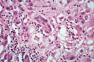 Note the acute inflammatory cells, mallory hyalin and