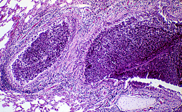 Mucopulurent material in bronchial lumen, bronchitis and peribronchitis.