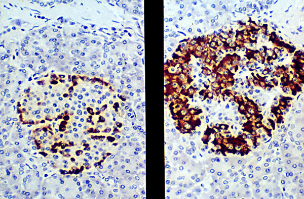 Normal islet, immunostained.
