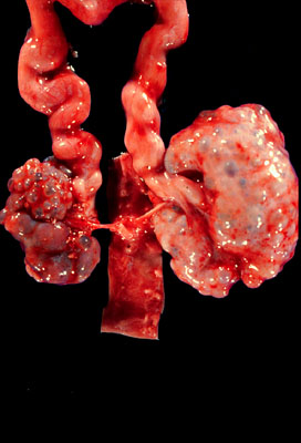 Abnormal fetal organization of renal tissue - gross - The kidneys are small and multicystic, renal components are disorganized. Note the large ureters, urinary tract obstruction early in development is the primary cause of cystic renal.