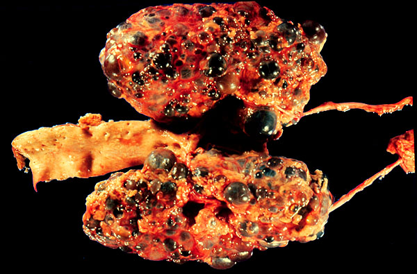 The kidneys are enlarged several times greater than normal. Dilated segments of tubules and collecting ducts form the cysts.
