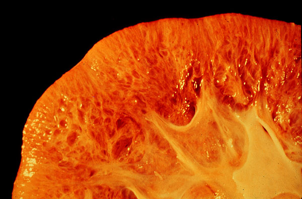 Gross, cut section - Note the uniform texture of the dilated collecting ducts.