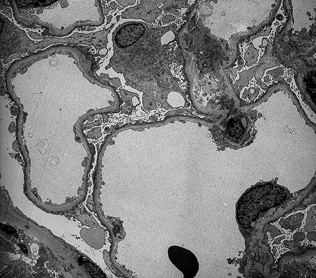 Electron micrograph - two glomerular capillaries and parts of a few others are present, the injury to the epithelial cells is manifest morphologically by effacement of foot processes.