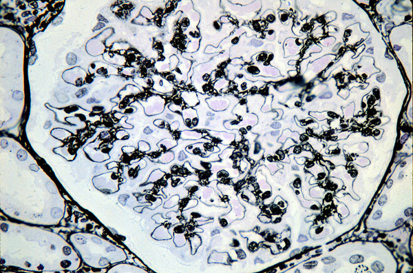 Micro - although it is called a glomerulonephritis, this disease is usually not inflammatory. The apparently thickened capillary basement membranes, which stain black with the Jones stain, are in fact a combination of basement membrane, immune complexes and epithelial cells.