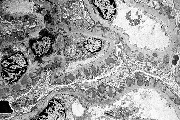 Electron micrograph - rows of dense immune complex deposits on the outside of the glomerular capillary basement membrane are evident.