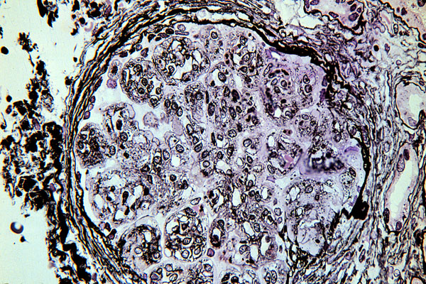 Micro, silver stain for basement membrane - duplication of the capillary basement membrane and inflammatory cells are closing down capillary lumens.