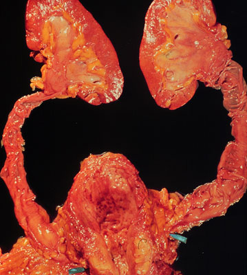 , ureters are enlarged, renal pelvis is large, renal medulla and cortex are atrophied.