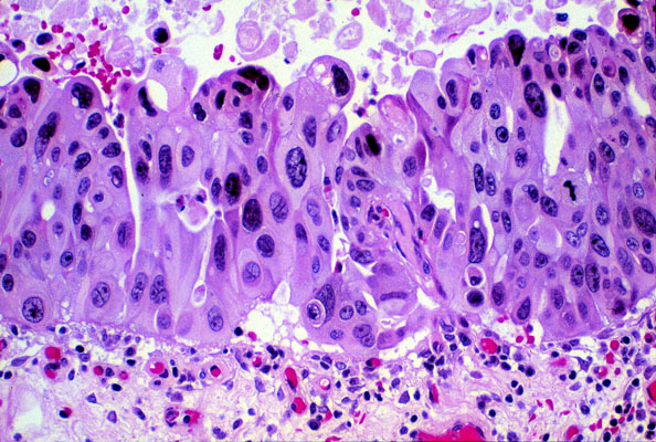 The normal transitional epithelium has been replaced by thickened epithelium composed of cells that have hyperchromic nuclei and vary in size and shape. The nuclei show no polarization. These flat carcinoma-in-situ lesions are prone to endophytic growth and invasion of the bladder wall.