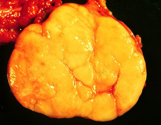 The testis contains a yellow lobulated mass that is sharply demarcated from the normal brown testicular tissue. The cut surface of the tumor appears uniformly yellow and shows no areas of necrosis or hemorrhage.