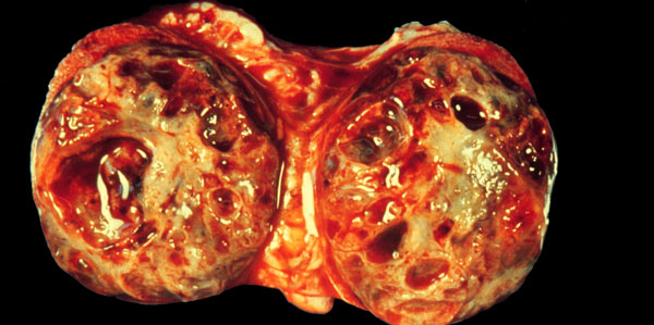which has entirely replaced the testis appears as a cystic mass composed of heterogenous tissues.