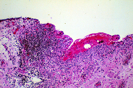 The mucosa of the urinary bladder is ulcerated and focally covered with blood. The submucosa is infiltrated with chronic inflammatory cells.