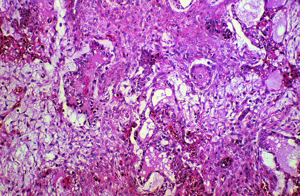 has a variegated appearance and consits of solid, cystic and reticular components.