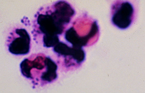 These polymorphonuclear leukocytes represent the discharge from the urethra of the infected patient. The cytoplasm of the PMN contains diplococci corresponding to N. gonorrhoeae.