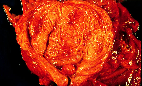 At the internal orifice of the urinary bladder, one can see the median bar of the prostate which protrudes into the lumen like a ball valve. The urinary bladder shows prominent trabeculation reflecting hypertrophy and hyperplasia of smooth muscle cells in its wall secondary to urinary obstruction.