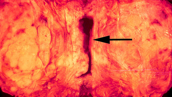 On cross sectioning of the prostate, the entire left lobe of the gland is infiltrated with a yellow