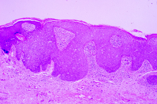 The thickened epithelium shows lack of normal maturation and contains atypical cells that frequently have vaculated cytoplasm.