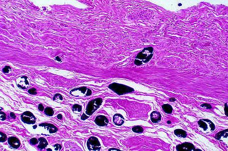 Schistosomiasis, histology. The urinary bladder wall contains numerous calcified ova of Schistosoma haematobium. The chronic inflammation leads to squamous metaplasia, and eventually squamous cell carcinoma in some cases. Squamous cell carcinoma is the most common type of bladder carcinoma in Egypt, where schistosomiasis is endemic.