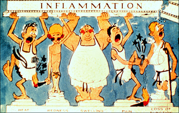 Rubor (redness); dolor (pain); calor (heat - but only of skin and extremities, because the underlying cause is movement of blood at the body's core temperature to areas that are environmentally cooled); tumor (swelling); and functio laesa (loss of function). Redness is caused by increased blood flow to the site, due to the action of mediators, axon reflex, and local increase in the hydrogen ion concentration. Heat is also due to increased blood flow and greater local cellular metabolism. Swelling is the result of increased blood flow, edema, infiltration of cells, and the proliferation of connective tissue in subacute-to-chronic lesions. Pain is due to the direct effects of mediators and the stretching of sensory nerves due to swelling. Loss of function is due to replacement of parenchymal tissue (e.g., damaged myocardium); reflexive disuse, due to pain; and mechanical, as when a joint either swells during acute inflammation or scar tissue that bridges it contracts as it matures in a chronic lesion.